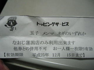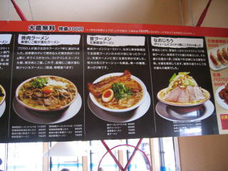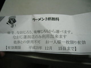 「ラーメン1杯無料」券は昔、なおじろう、味噌じろうから選べます、なおじろう大盛無料にしました。