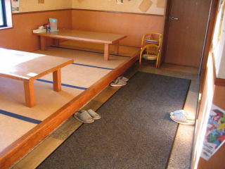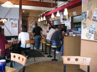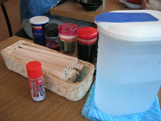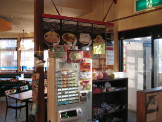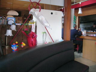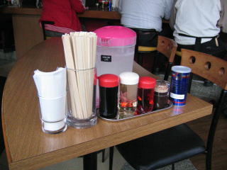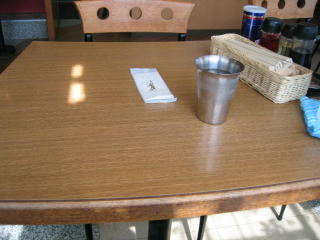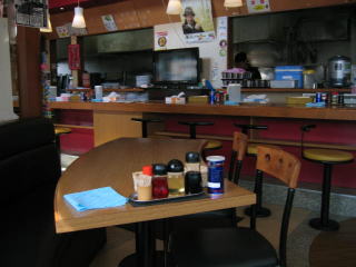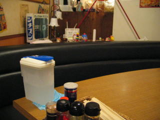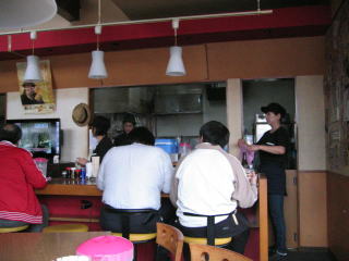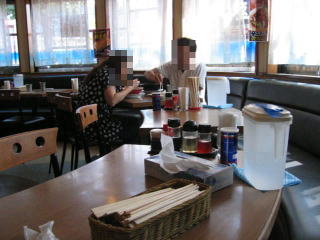ギューギューのカウンターの赤い上着のお客さんの右側の席から、ガラガラに空いているテーブル席へ移動です。