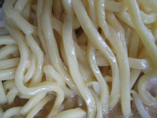 ゆで時間が少し足りないのか、咬むとフニャフニャします。