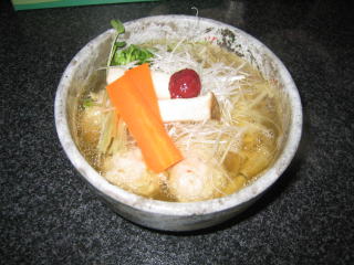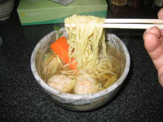 白い中太の平打ち麺、大きな肉団子が入っています。