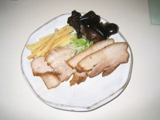 限定ちゃーしゅーめん、しお、900円をいただきました。まずちゃーしゅーなどトッピングのお皿が先に出てきました。