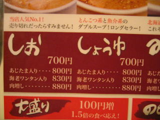 今夜は「しお」700円の普通盛、「つけそば」大盛無料800円にしました。