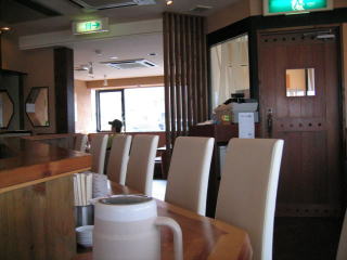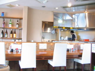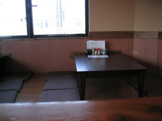 正面に厨房とカウンター席、その回りをテーブル席が囲み、その外の窓際が小上がり席です。