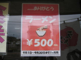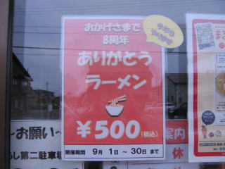 「おかげさまで8周年ありがとうラーメン500(税込み)」、9月30日までです。