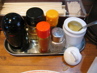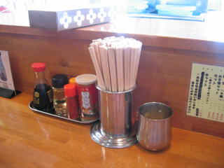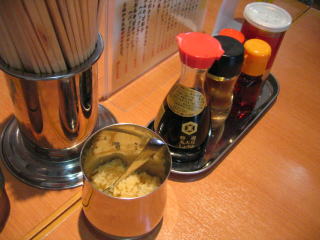 テーブルには割箸、薬味類、おろしではなくて刻んだニンニクがあります。