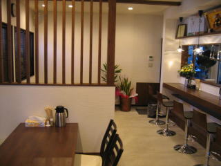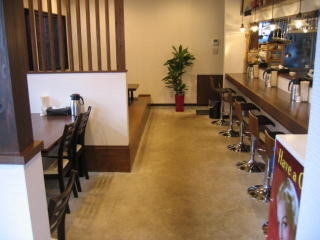 右手に厨房とカウンター席6席、左側には手前から2席のテーブル席、4席のたーブル席です。