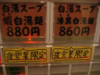 他の方のブログなどの情報によれば「白湯スープ蝦(えび)白湯麺」880円と「白湯スープ漆黒(くろ)白湯麺」860円とのことです。