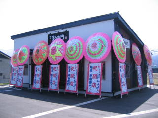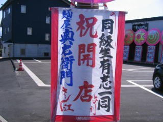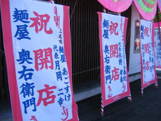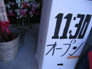 お店正面の開店祝いの花輪は右側にあごすけさん、春紀さん、青桐さん、一晃亭さん。