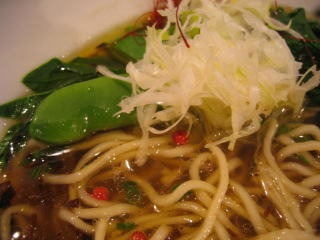 続いて「丸鶏スープ爽辛麺」、糸唐辛子、白髪ネギ、炙り鶏チャーシューなどが載っています。