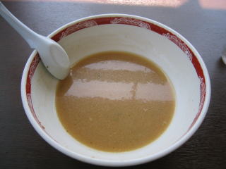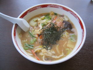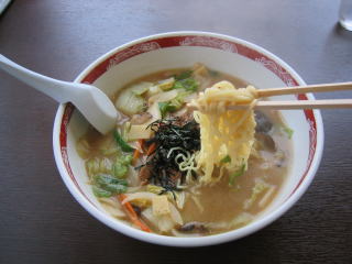 少し甘めの味噌スープに縮れ細麺でした。