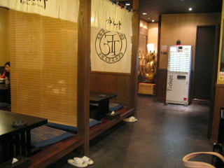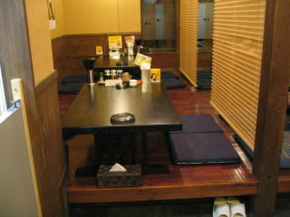 右側には居酒屋風の小上がり席がたくさん、左奥に厨房とL字型カウンター席です。