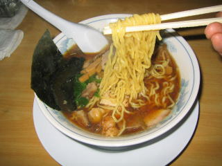 麺は黄色の中太麺、濃い色の生姜の効いた正油スープです。