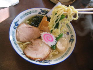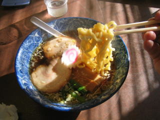 プリプリの極太麺強縮れ麺、あっさりとした醤油味です。