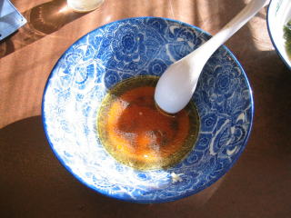 麺も同じく極太強縮れ麺です。きれいな透きとおったスープです。