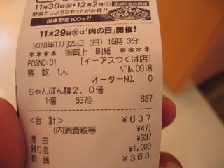 平成30年11月23日 茨木県つくば市の「長崎ちゃんぽんリンガーハットイーアスつくば店」さんにお邪魔しました。