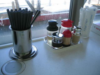 今日はカウンター席の左一番奥の席です、国道8号線を走るトラックなどが良く見えます。