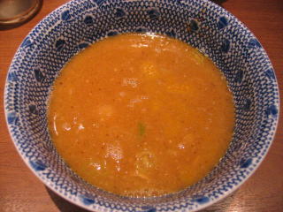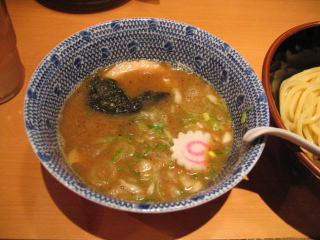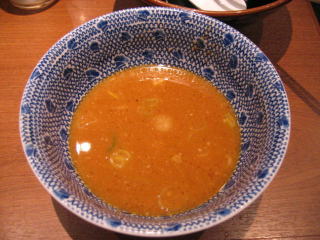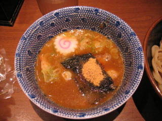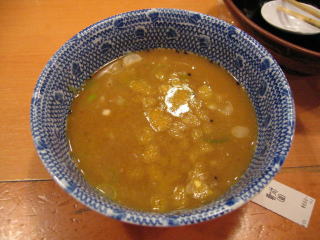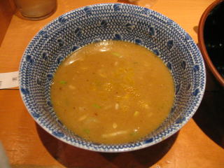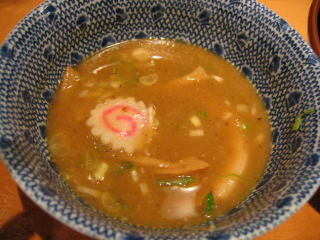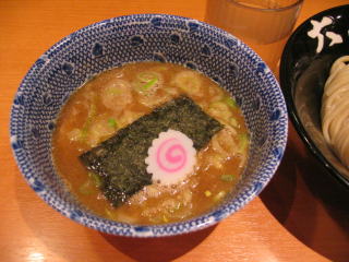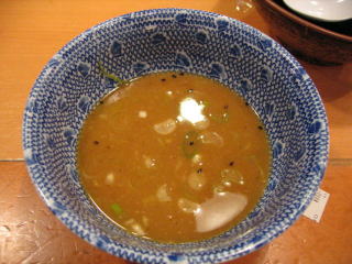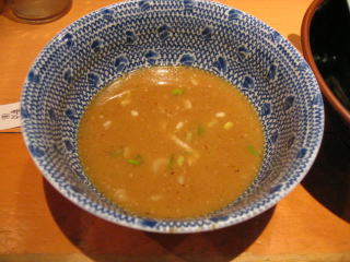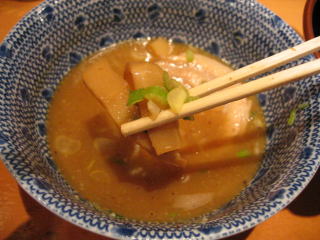 醤油ベースの魚系の温かいつけだれにつけていただきます。