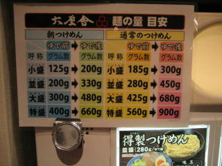 朝は「朝つけ麺」しかやっていませんが、盛は普通盛り、大盛り、特盛などが選べます。