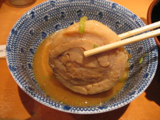 豚バラのチャーシュー?大きくて厚くて丸いお肉が1つあります。
