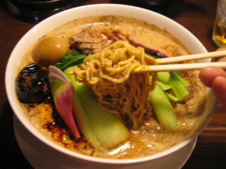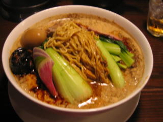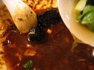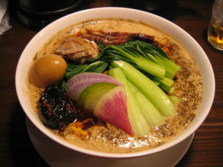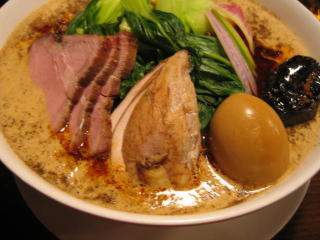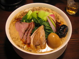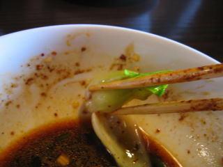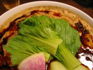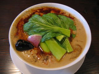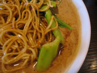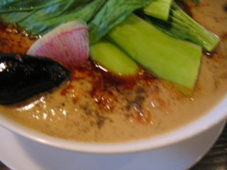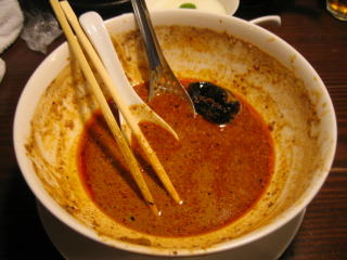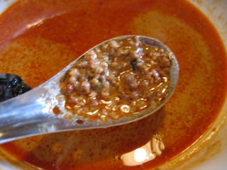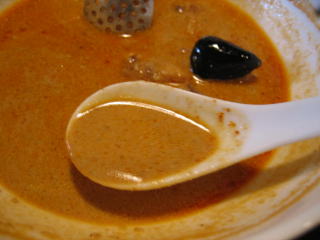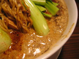 胡麻の粒がいくつも見えます、知っている中で一番胡麻が濃い濃厚なポタージュの様な担担スープです。