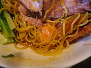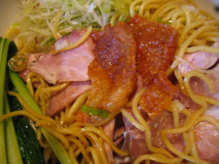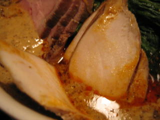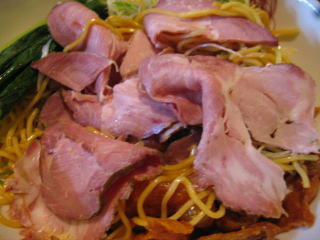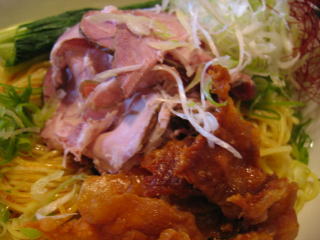 レアなチャーシュー2枚とその下には鶏のチャーシュー、もしかしたら燻製してあるのかもしれません。