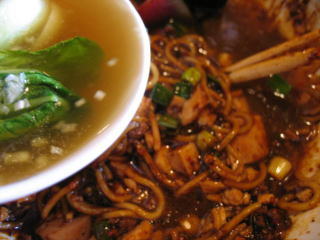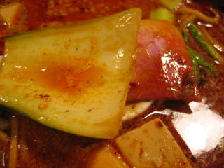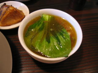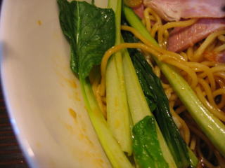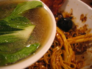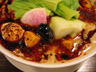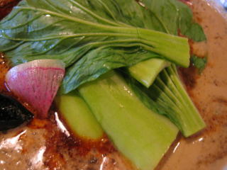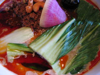 大き久手緑濃い青梗菜、赤かぶ、黄色い担担?スープ、赤くて辛い辣油と彩鮮やかです。