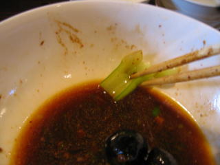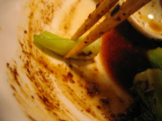 青梗菜でどんぶりの縁の麻婆餡をスープに溶かし込みます。