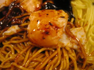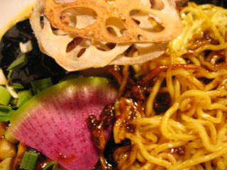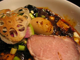 トッピングにレンコン、アカカブ、チャーシュー、そしてそれらの下に味玉が潜んでいました。