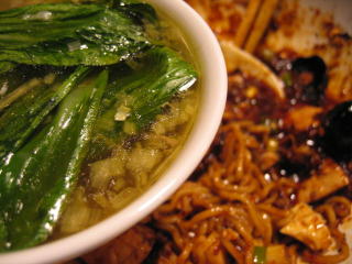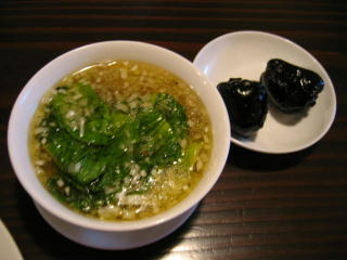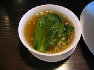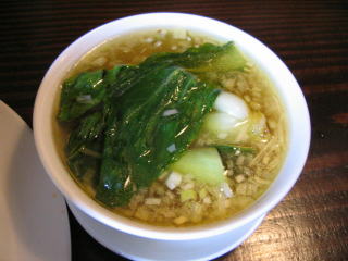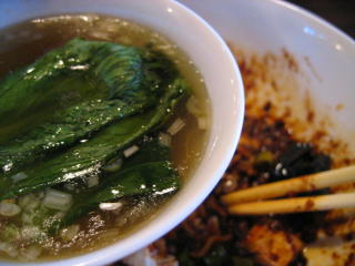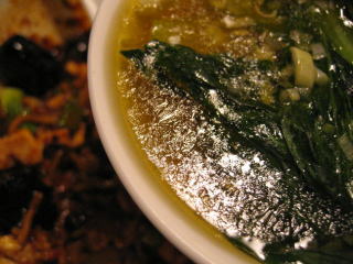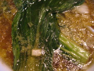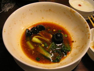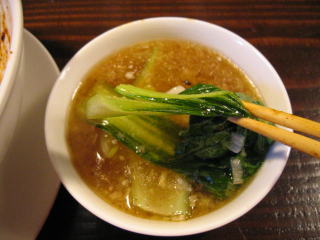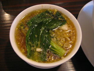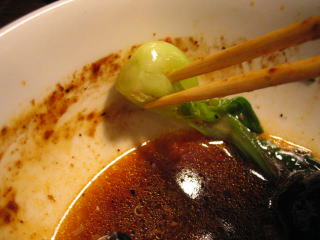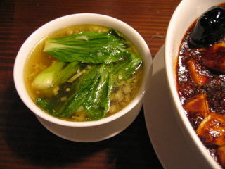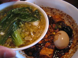 青梗菜をワイパー替わりにして麻婆餡を全部スープに溶かし込みます。