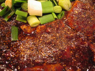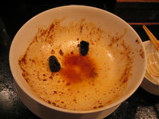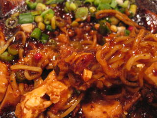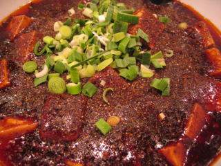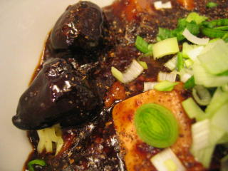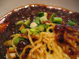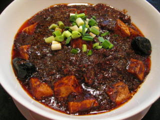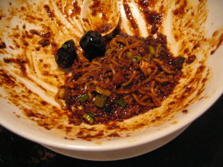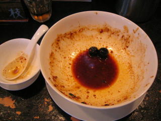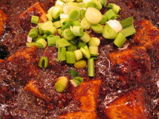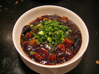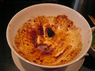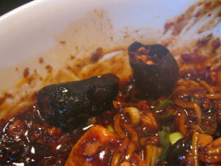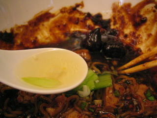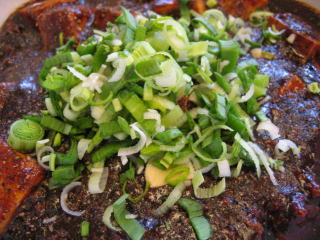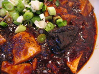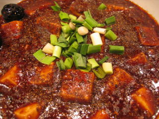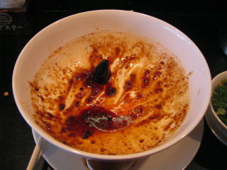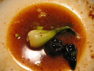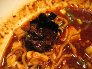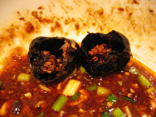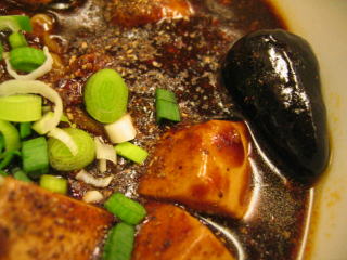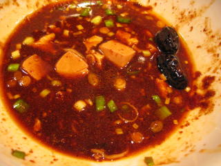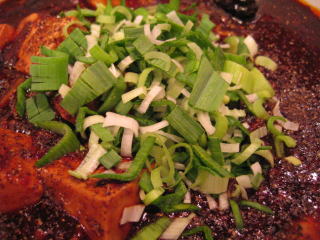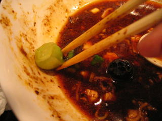 刻んだ万能ネギ、真っ黒い揚げ唐辛子2つが乗っています。