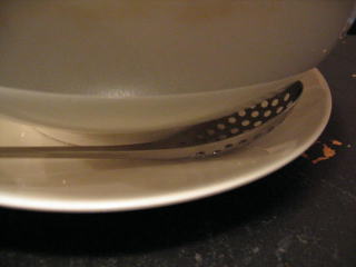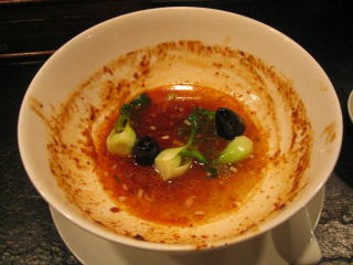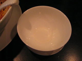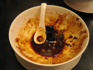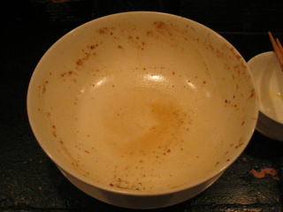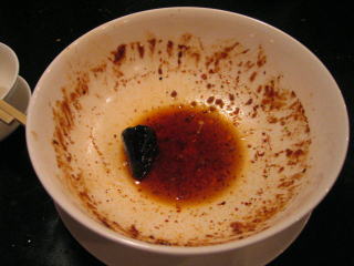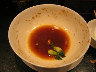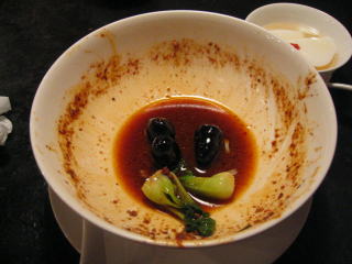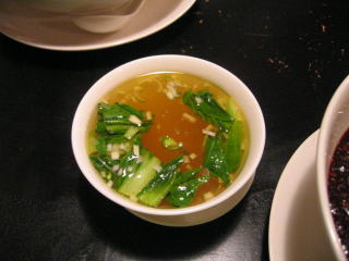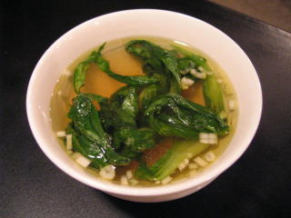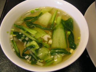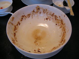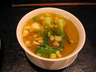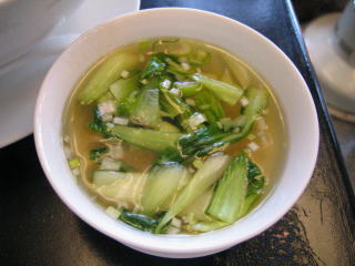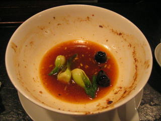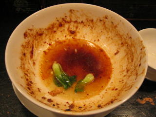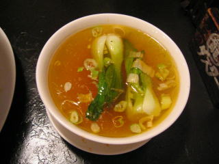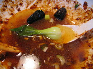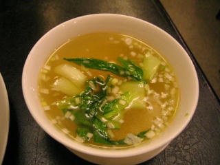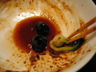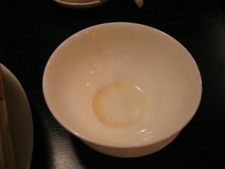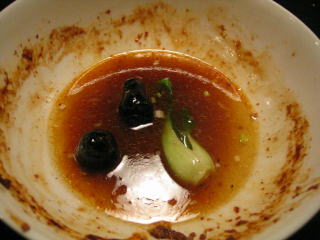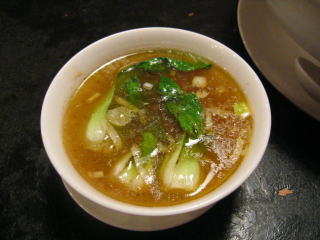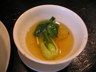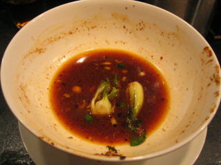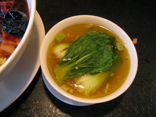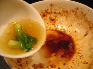 青梗菜をモップ代わりにしてどんぶりに縁の残った餡をスープに溶かし込みます。