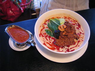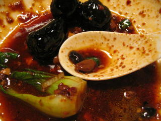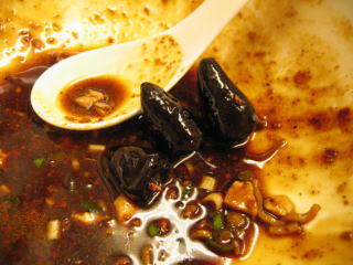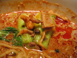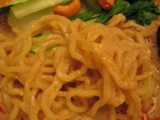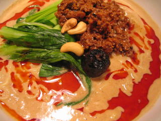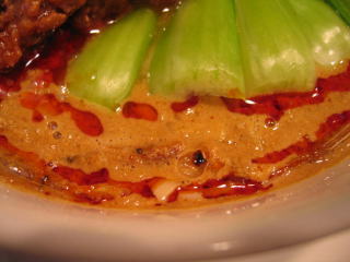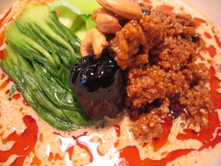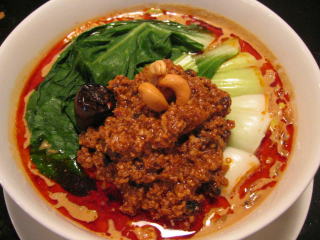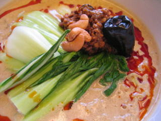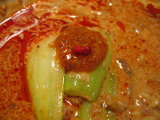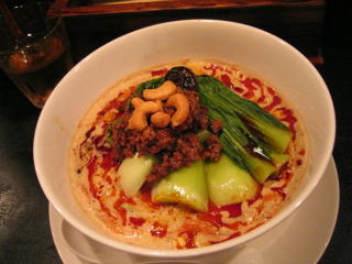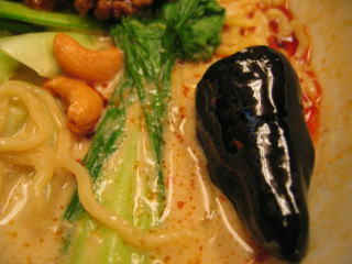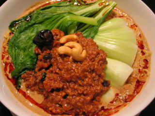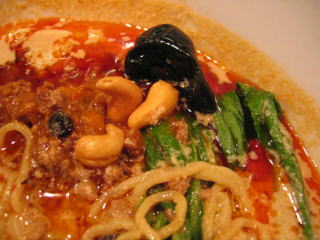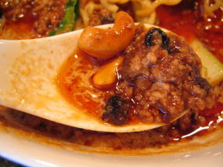 黄色いスープ、赤い油、緑の青梗菜、茶色い肉味噌とカシューナッツ、黒い揚げ唐辛子と彩りも豊です。