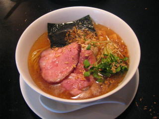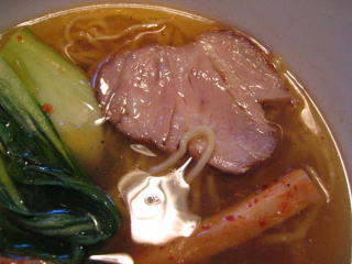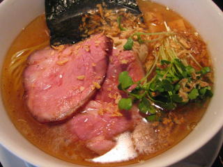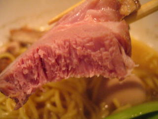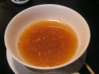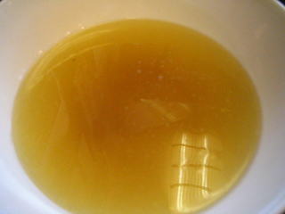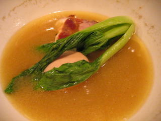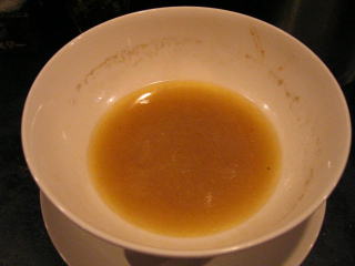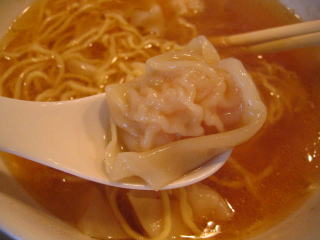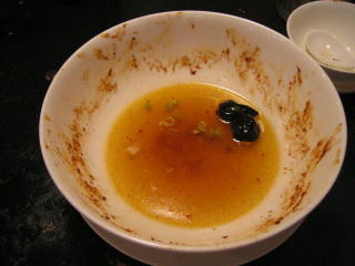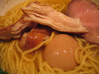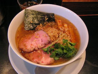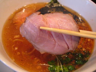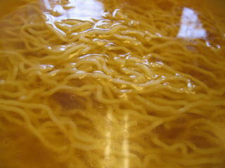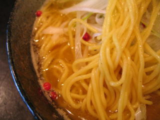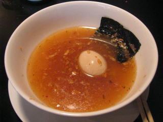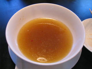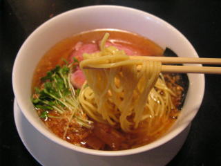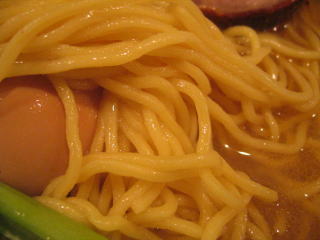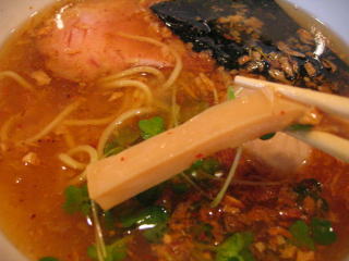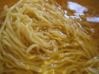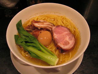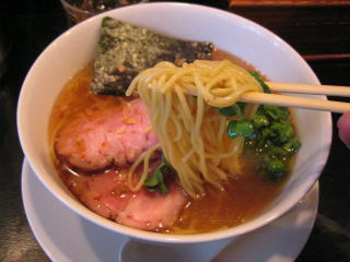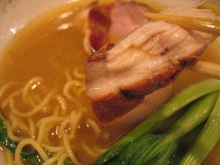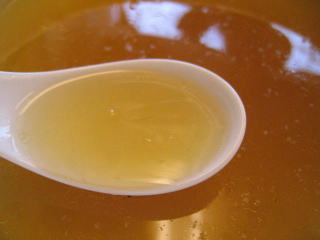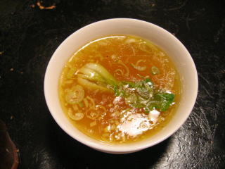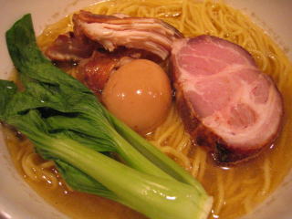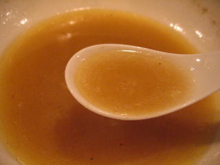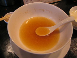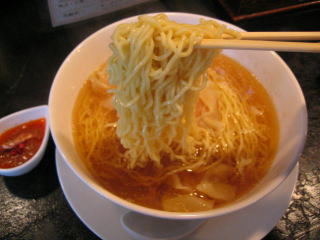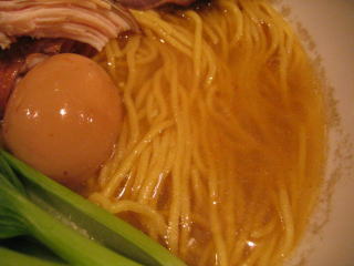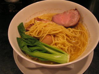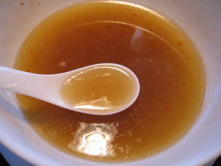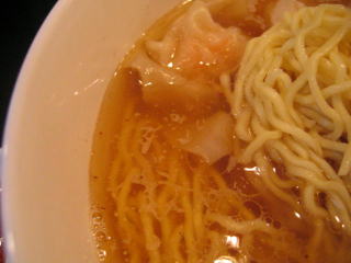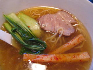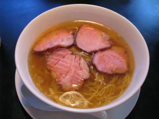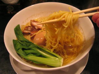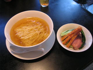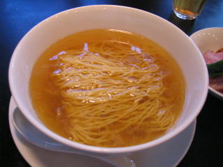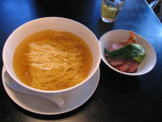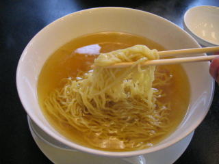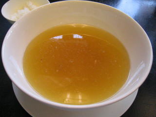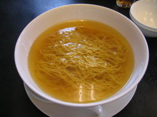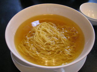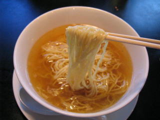 透明な油の浮いた黄色く透き通ったスープ、麺のみのシンプルなラーメンです。