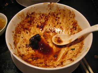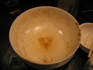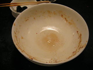 まだどんぶりの縁に残った麻婆餡を食べようとしています。