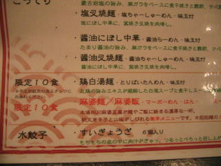 「麻婆麺」は午前で終わり、「担担麺」と「塩拉麺」しかないとのことです。