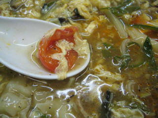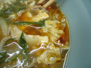 キクラゲ、しいたけ、豆腐、卵などが、ちょっと酸っぱくてちょっと辛い餡のスープに混ざっています。
