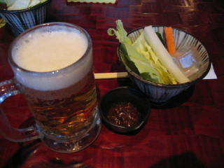 ほどなくして生ビールと、生野菜のお通しがきました。