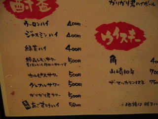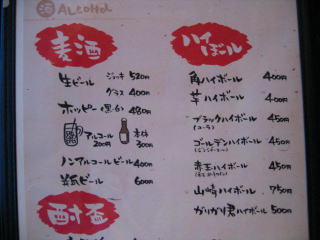 お飲み物も麦酒、ハイボール、焼酎、ウィスキー、ソフトドリンクなど豊富です。