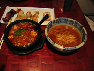 麻婆の餡がたっぷり入ってどんぶりと、甘いえびの香りのするえび出汁スープに麺が入ったどんぶりが2つきました。