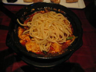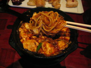その麺をえび湯から救い上げて、麻婆餡に載せて混ぜます。