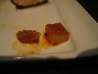 1センチ角弱の具材、右は固くクワイのような違うような、左は柔らかく脂のような違うような。