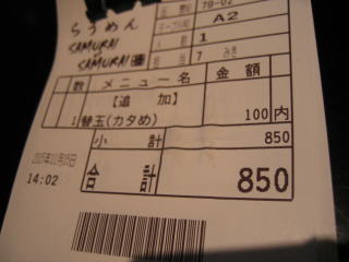 「替え玉」100円を「麺カタめ」で頼むと1分位できました。