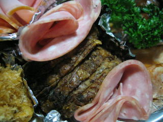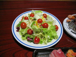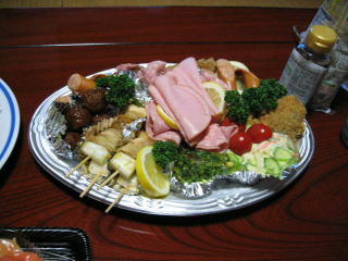 オードブル盛り合わせ、お野菜たっぷりサラダ、お刺身、エビフライ、カニ。