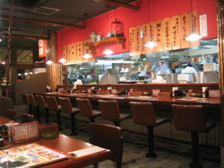 玄関より入ると、正面にカウンター席と厨房、右側にテーブル席と小上がり席です。