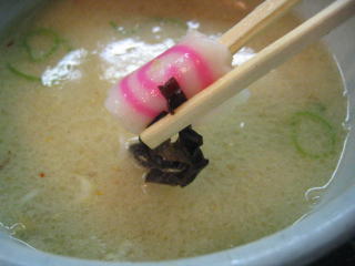 ナルト、キクラゲ、メンマ、チャーシュー、ネギなどが見えます。