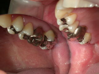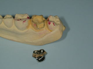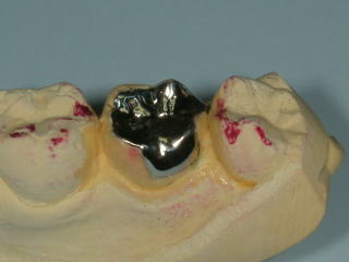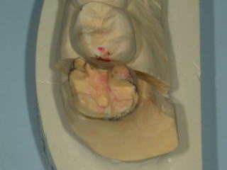 ミラー像、一番奥の歯 その作業模型 銀歯の厚みが分かりますでしょうか?