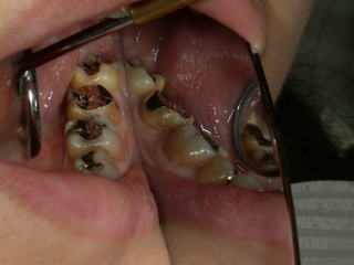 上の奥歯には特に実質欠損は見当たりません。しかし、根にはエナメル質のカバーがないので露出しますと何の虫歯がなくてもしみるケースは多いと思います。