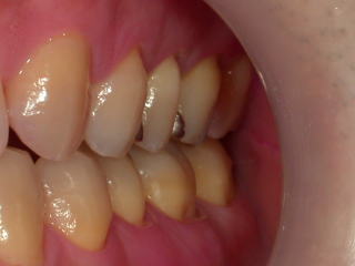 良く観察しますと、左下の5番目(第二小臼歯)の歯は根面が露出し、歯肉との境目のところに、歯ブラシで削れたと思われるくさび状欠損があります。