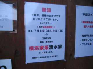 開店1周年記念ということで2日間のみの限定「横浜家系清水家」を営業します。