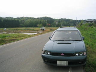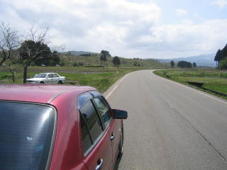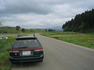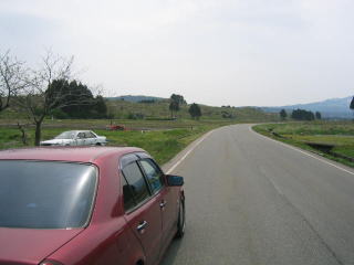 場所は約9キロ地点の新道給水所付近、車はマラソン走行方向、中間点の方を向いています。
